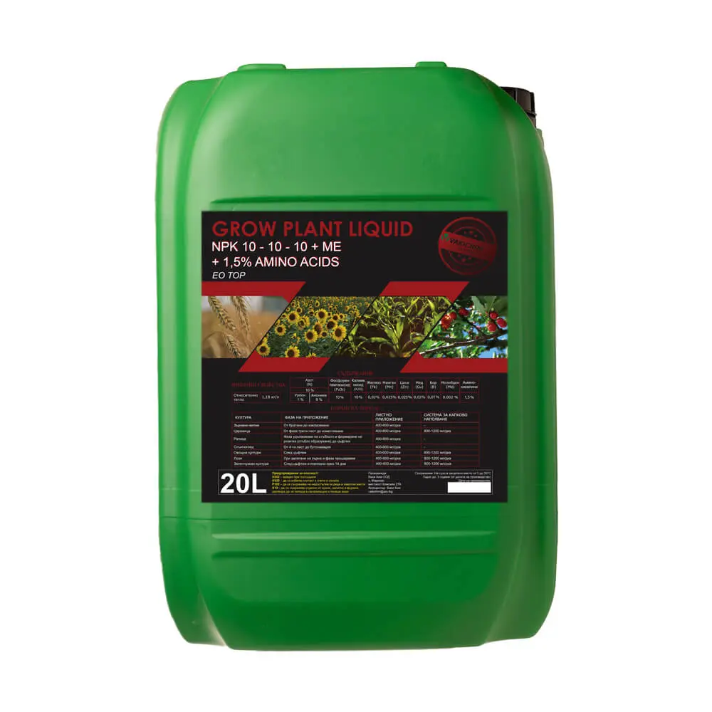 Grow Plant NPK 10-10-10 + 1,5% аминокиселини е универсален течен тор, съчетаващ минерални и органични съставки за цялостно подхранване на растенията. Той съдържа равни пропорции на азот, фосфор и калий, които осигуряват балансирано развитие през цялата вегетация. Благодарение на добавените аминокиселини, този тор подпомага усвояването на хранителни вещества, стимулира растежа и повишава устойчивостта на културите към стресови фактори като суша, студ и болести.